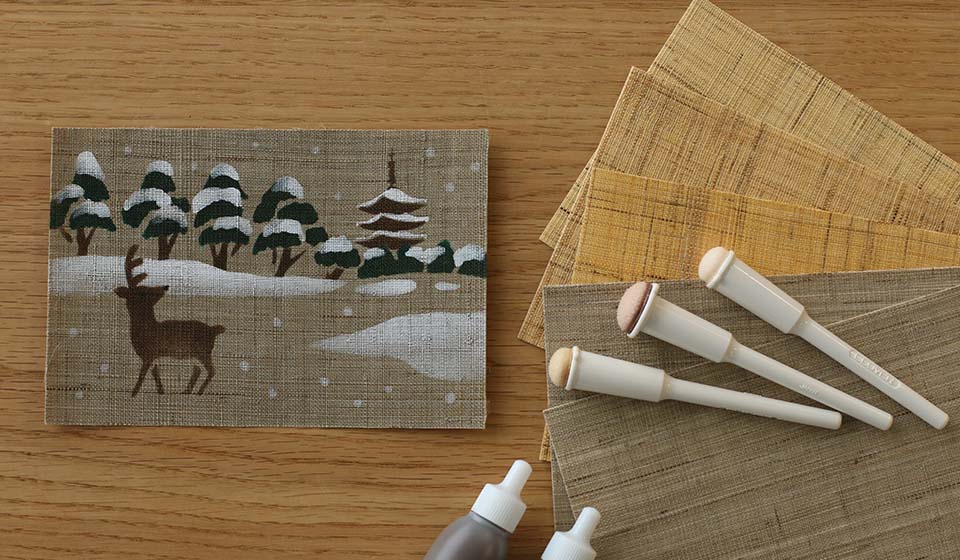 「麻はがき体験」は12月より、冬柄「鹿と冬景色」がはじまります。