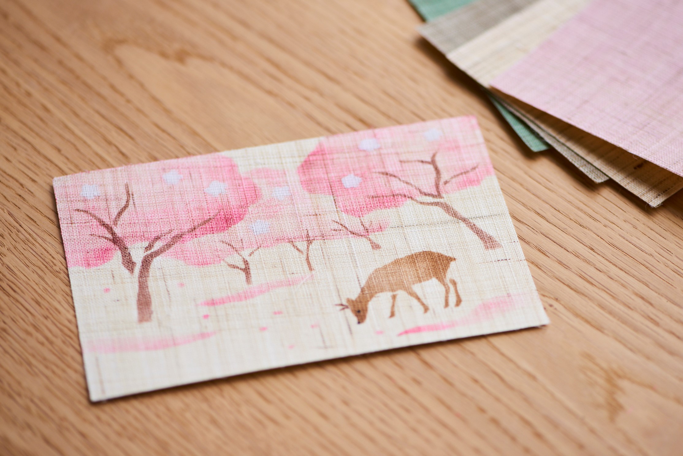 「麻はがき体験」は春限定柄の「鹿と桜」をご用意しています。