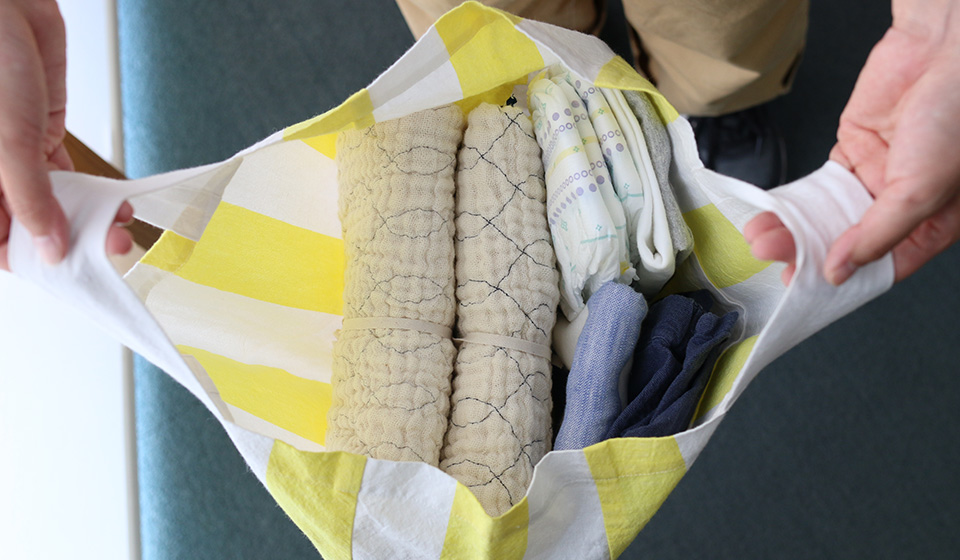 週の頭に保育所に持っていくのは、着替えやオムツといった普段の荷物に加え、お昼寝用のバスタオル2枚にシーツと盛りだくさん。