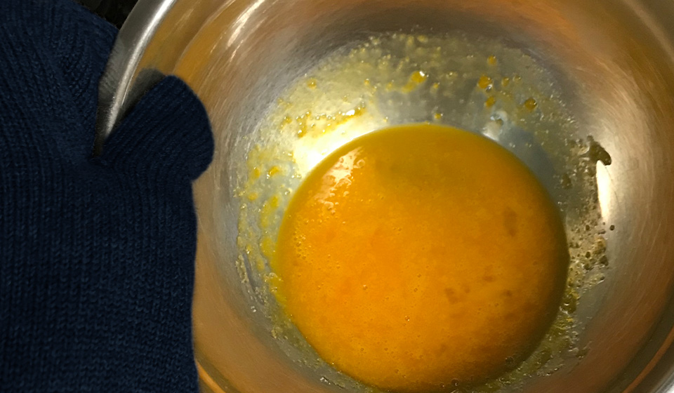 最初のステップは卵黄と砂糖を湯煎にかけながら混ぜる工程なのですが、この軍手、熱くなるボウルをおさえるのにもちょうどよいのです。