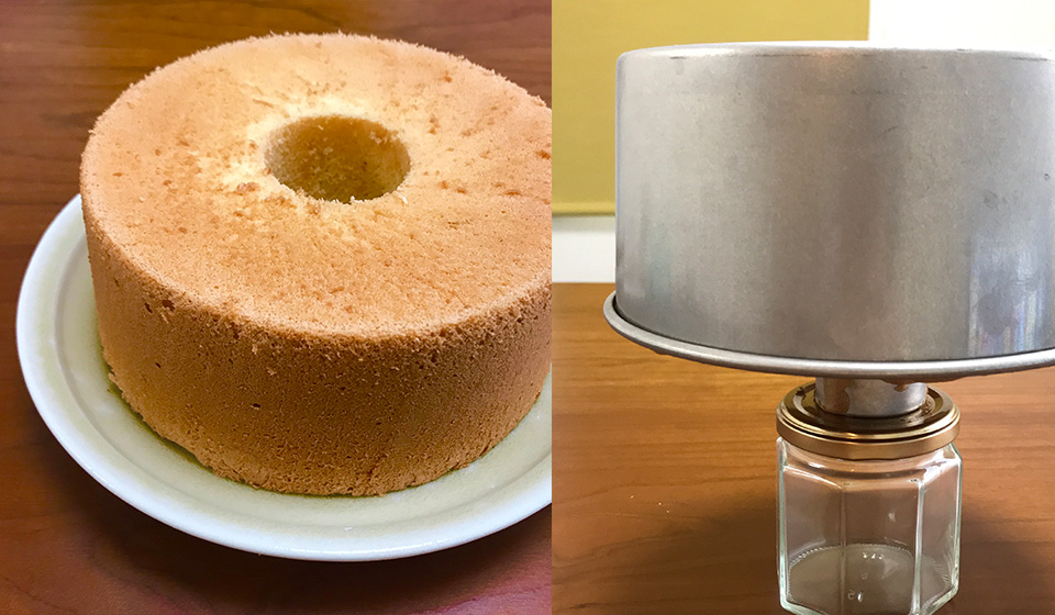 シフォンケーキは焼き縮みを防ぐため焼き上がり直後に型ごと逆さまに返して空き瓶などの上に置いて冷ますのですが、その際火傷を恐れるあまり手元が狂い、あらぬところに丸ごとケーキを落としてしまったのでした。