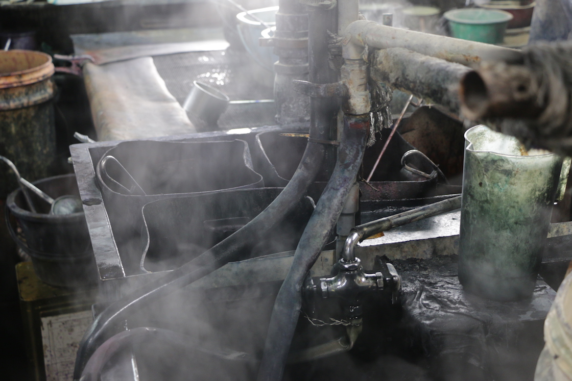 その土手の中に、ドヒンと呼ばれるじょうろのようなもので染料を注ぐと同時に、染台に設置された減圧タンクを足元のペダルで操作して、下から吸引していきます。