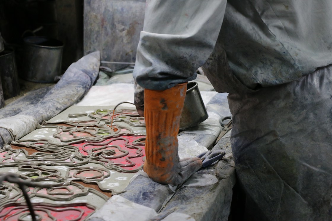 染めの必要のない部分に染料が流れないよう、ケーキのデコレーションをするような容器から糊を絞って境界線となる「土手」を作ります。まるでパテシエのような細かな作業!