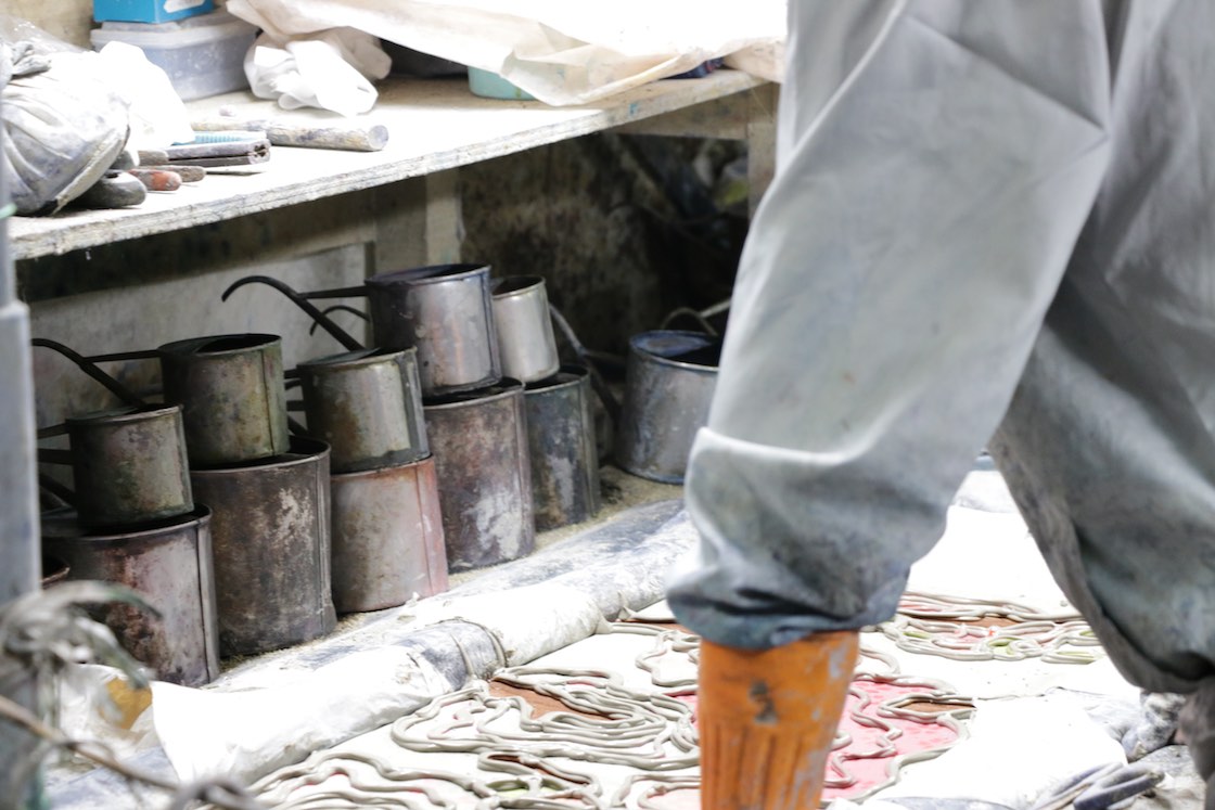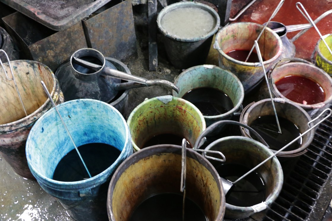 ▲工場にはさまざまな色の染料が色が多く使えると楽しい!と語るのは株式会社協和染晒工場の小松さん。1枚の絵画のように繊細な技を生み出す、伝統工芸士です。
