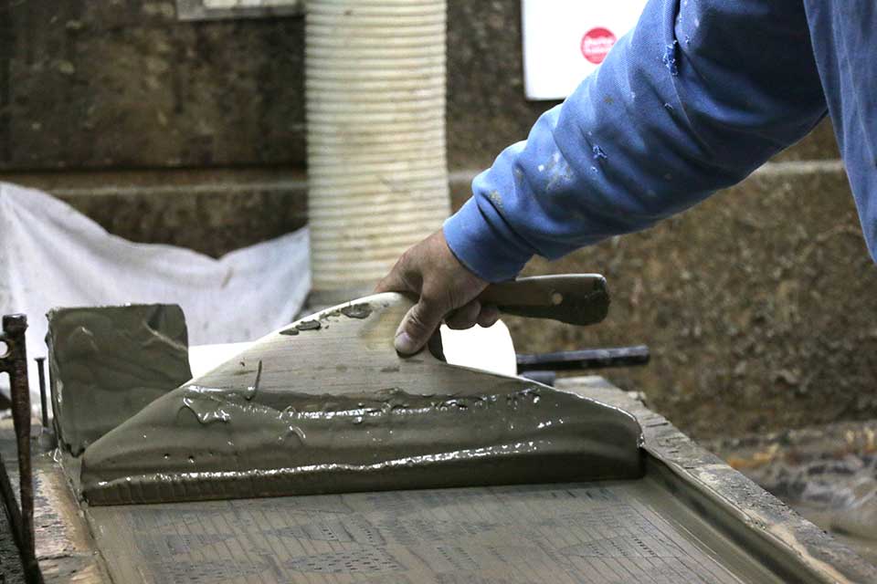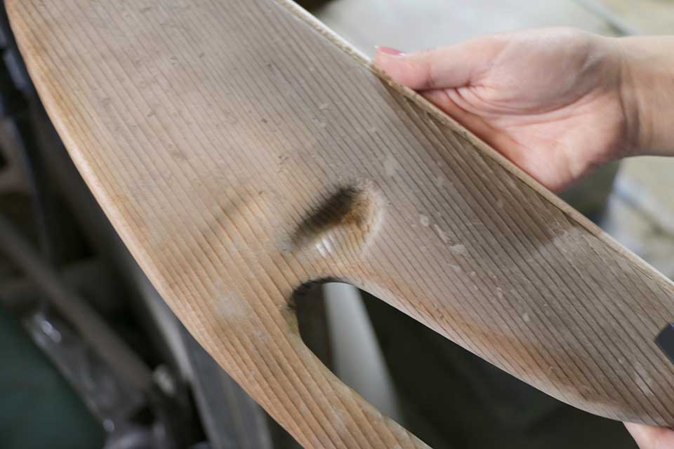 ▲木へらには職人さんの指跡がくっきり!大変な力業ですね。