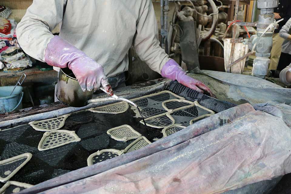 生地の上に型紙を固定し、その上から木へらで防染糊を載せていきます。