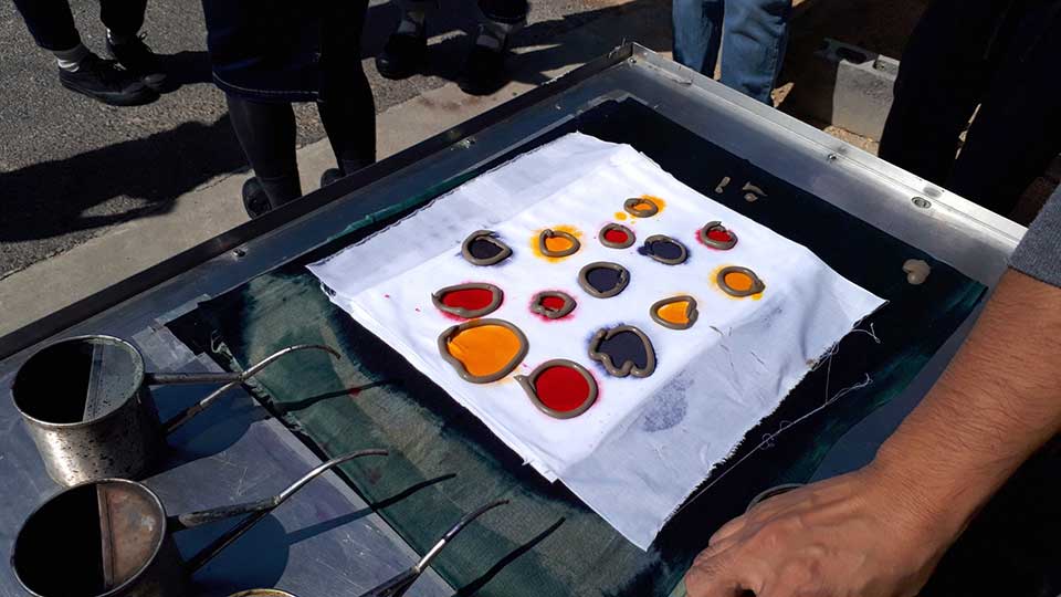 今回は土手を丸く引き、染料が広がりすぎないよう、その中に慎重に染料を注いで、優しい丸模様を1人ずつ描きました。