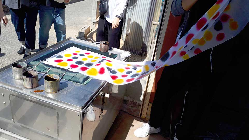 その限りない挑戦には、私たちもその技を伝える使命を感じます。ナカニさんが注染を伝えるためにつくった特別な機械で、私たちも体験をさせていただきました!