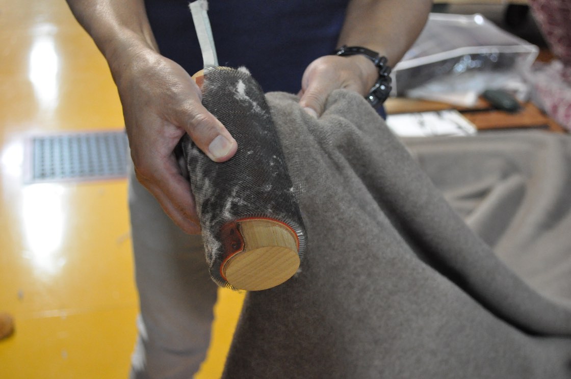 ウールの場合は繊維が弱いので、摩擦を抑えて毛羽を取るため、濡れている状態で一度起毛の機械にかけ、乾かした後に残りの仕上げの起毛をかけます。