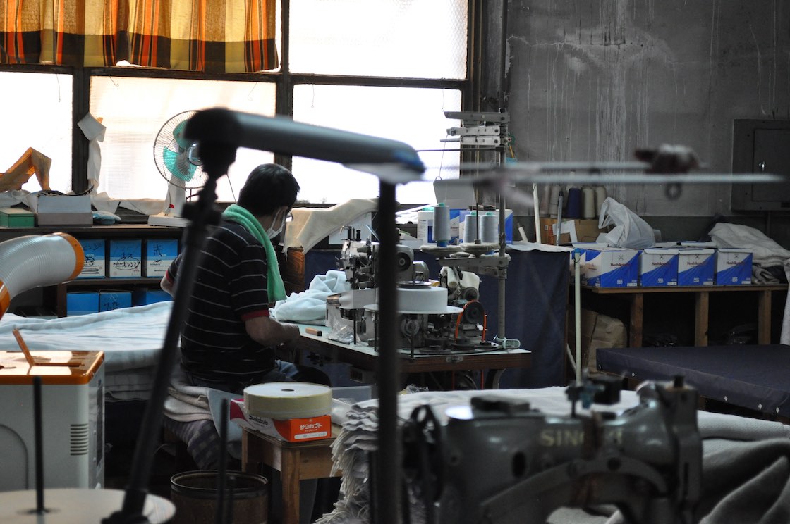 最後の縫製工程では、両方のふちにヘムを縫い付けて裁断し、手作業で幅方向のヘムとタグを縫い付けて完成。
