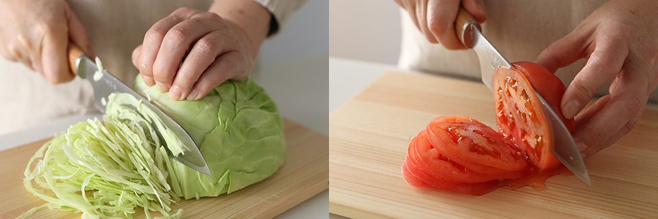 嵩張るキャベツから小さな果物まで1本で何役も取りまわせる、現代の定番包丁となることを目指した包丁の使い心地をぜひお試しください。