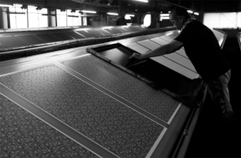 型おこし、職人の長年の経験による染料の色合わせ、そして一色づつ繰り返し刷っていくその工程は全て手作業によるもの。