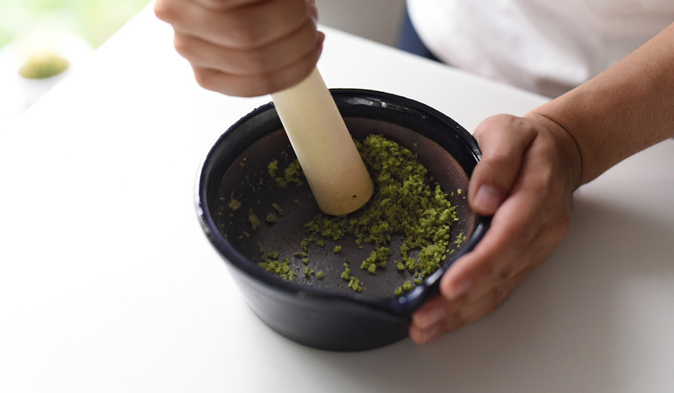 4.ゆずと青唐辛子を合わせて、すり鉢でする。