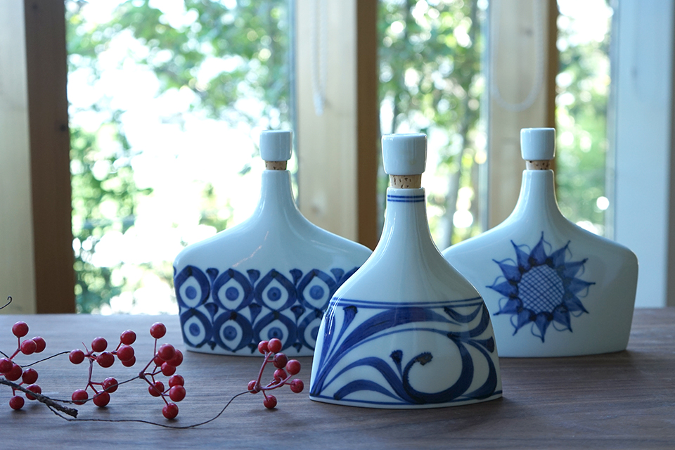 唐草や草花などを意匠化した斬新な文様を、藍色で描いたモダンなデザインが多く、温かみのある白い素地に藍色の太めの線が良く映えます。