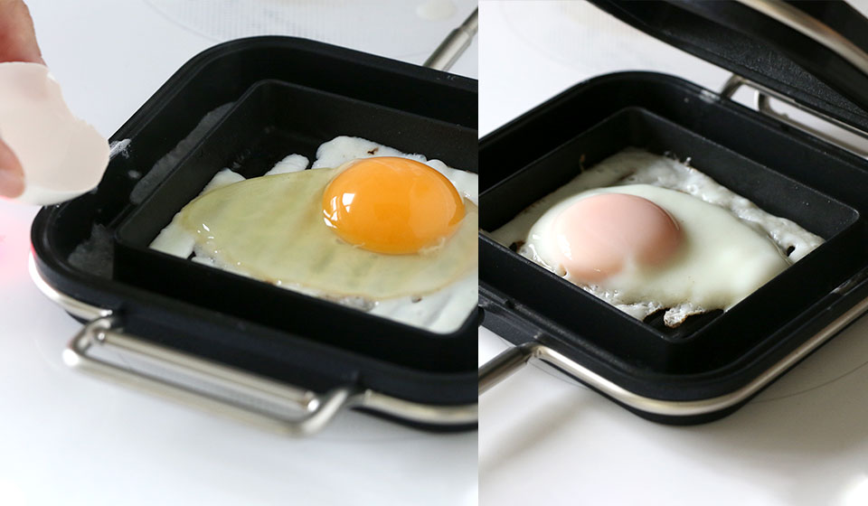 目玉焼きは、回りの溝に水を入れれば蒸し焼きのようになってふっくらときれいに焼けて、