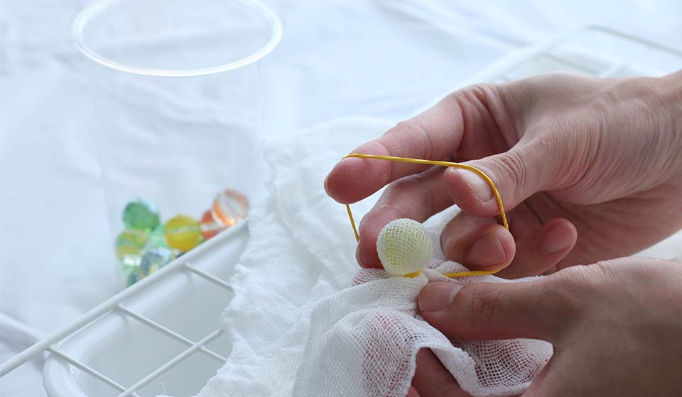 ビー玉と輪ゴムで白い花ふきんを絞り、染料をかけることで、お好みの柄と色に仕上げることできます。