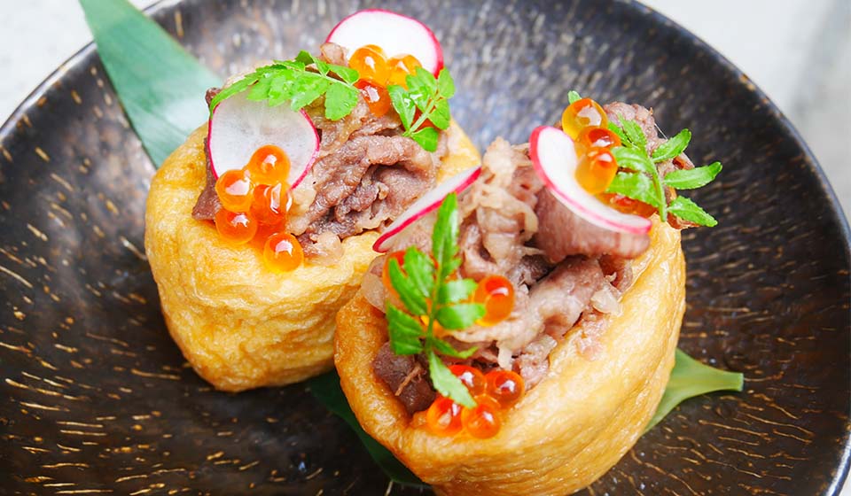 奈良県産の大豆でつくったお揚げに包まれた、さっぱり酢飯に黒毛和牛といくら。