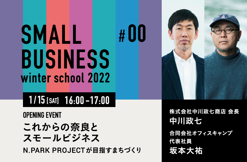 「スモールビジネスで奈良を元気にする!」をビジョンに、中川政七商店がスモールビジネス事業者への事業支援を通じてまちづくりに取り組むN.PARK PROJECTでは、このたび1月中旬から2月中旬にかけ、経営に役立つさまざまな講座を集めた “冬期講習” 「SMALL BUSINESS winter school 2022」を開催します。