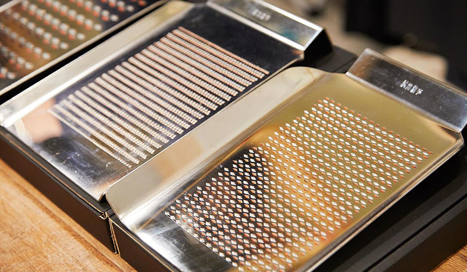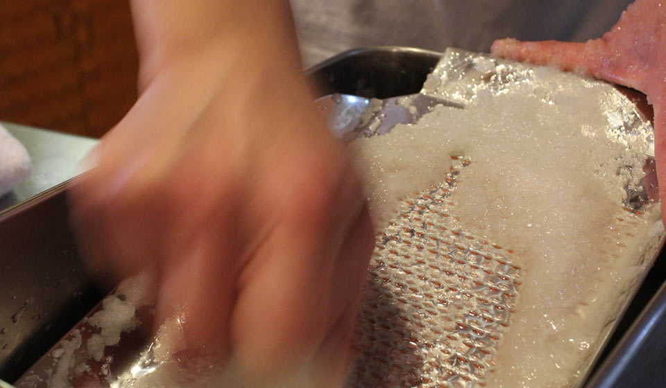 ここが美味しさの秘密で、新家さんいわく「目の一つ一つが刃となってしっかりと食材に当たるので、食材のよさを活かしたまま擦りおろせる」とのこと。直角だと目詰まりしにくいので、水の力だけで洗いやすいところも気に入っています。