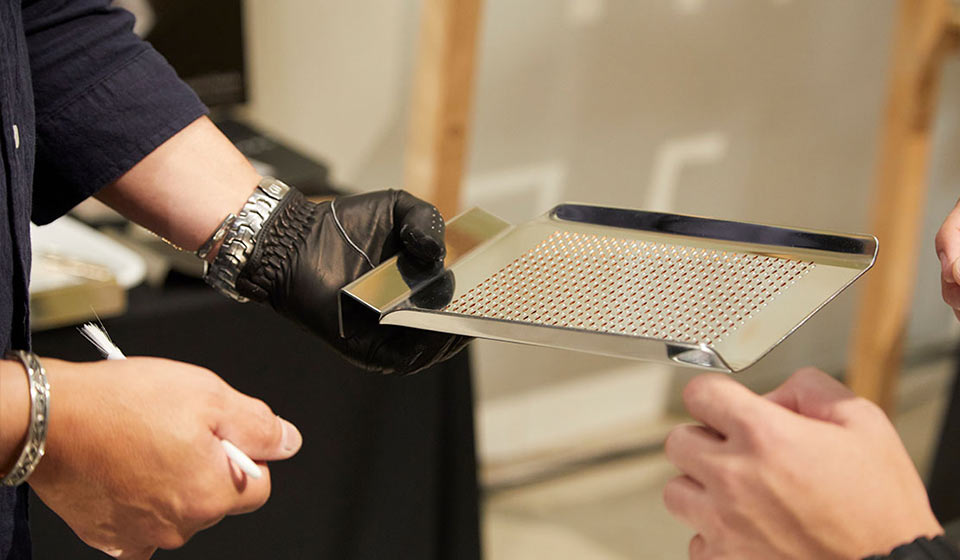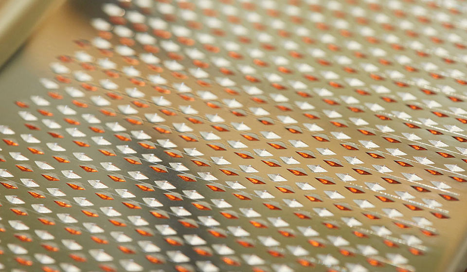 伝統的な調理器具であるおろし金は、作り手の減少で存続の危機にあります。作り手の新家崇元 (しんけ たかゆき) さんは、それを知って全くの異業種から独学で作り方を研究。斜め45度にいれるのが一般的な「目立て」を、直角に変えて誕生したのが、このおろし金です。
