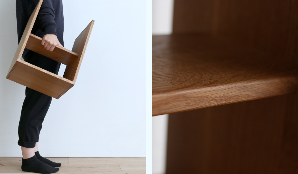 逆さにしても持ち運びやすいよう、中板だけは角を丸くして、手に馴染みやすくなっている