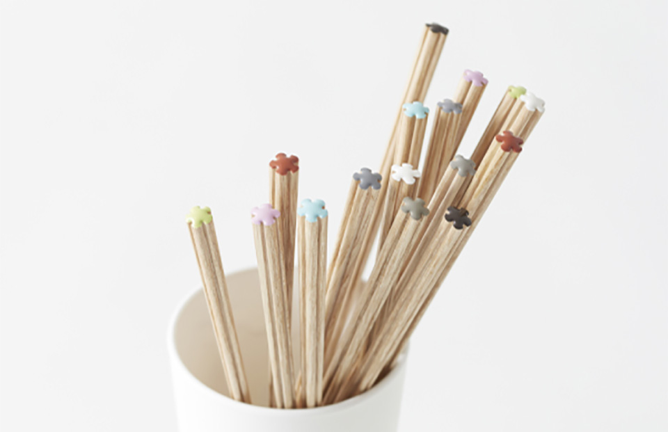 お箸のデザインというとほとんどが色や模様での表現ですが、hanatabaは形そのものがお花のようになっています。本体はシンプルな白木で、天の部分だけワンポイントで色がついているので、さりげないアクセントを楽しみながら日用使いできるのが気に入りました。