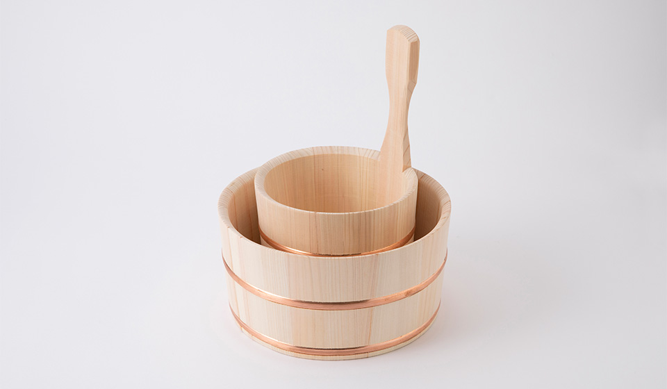 桧の香りと手触りで、毎日温泉気分です。谷川木工芸の湯桶・片手桶