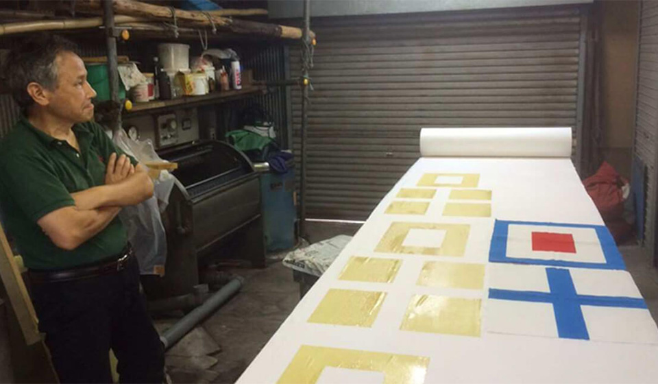 何より好きなのは、手仕事を感じる染めや線のゆらぎ。函館で実際に旗をつくっている加賀谷旗店が、染料を含ませた刷毛を使って一枚一枚染めています。