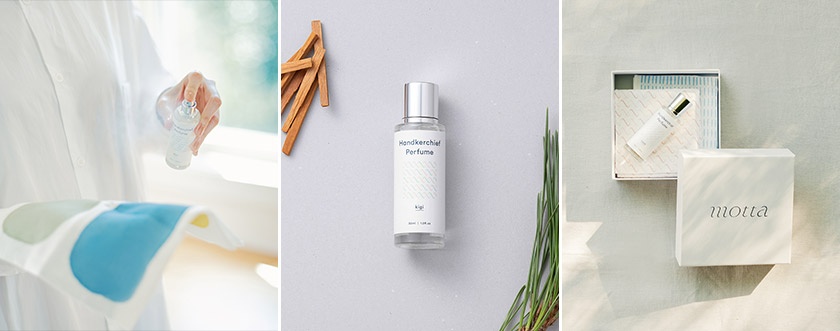 「昨日、今日、明日。新しい気持ち。」 目がさめる。窓をあける。 顔をあらう。歯をみがく。 朝ごはんを食べる。 身じたくをする。 ハンカチを選ぶ。香りをふる。 明るい色に、華やかな香り。 やわらかい生地に、落ち着いた香り。 特別な柄に、とっておきの香り。 忙しい朝に一瞬、 いまの気持ちを見つめる。 昨日の楽しいも、明日への不安も、 いつかくる喜びも哀しみも すべて包みこんで、 そして、ささやかに、願う。 今日も、良い一日になりますように。 お守りのように、ハンカチを、持った。 だいじょうぶ?だいじょうぶ。 ひとつひとつの気持ちを、確かめながら。 ひとりひとりのリズムに、よりそいながら。 また、新しい今日が、はじまる。