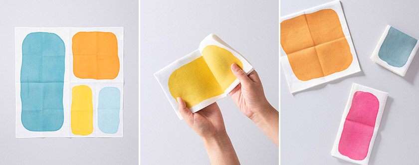 一日の中でうつろう気持ちに寄りそって、ハンカチを開くたびに、少しずつ色が変化していきます。夜明けのさわやかな青、昼間の黄色、夕方のオレンジ、夜の群青など、時間経過を表現しています。