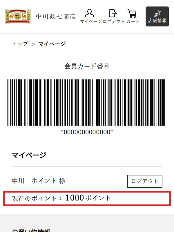 レジでお買い物の際に、お持ちのスマートフォンでオンラインショップにログインしていただき、マイページに表示されます会員バーコード(図)をご提示ください。