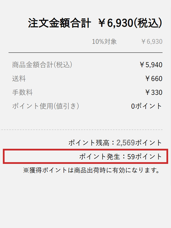 合計金額は5,940円となり「100円 = 1pt」ですので、ポイントは59ptが付与されます。