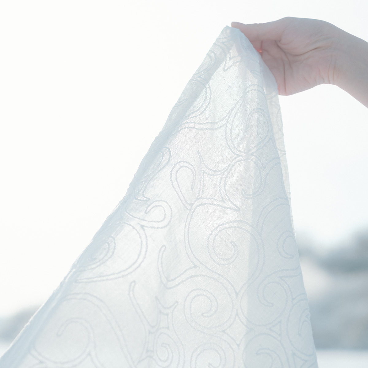 阿寒湖の自然の空気をそのまま切り取ったような表現を目指し、雪、空、木々、この3つの印象を色に重ねて、くらしの工藝布」を作り上げました。
