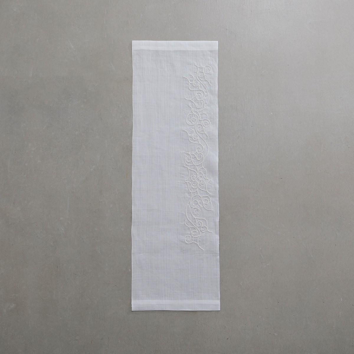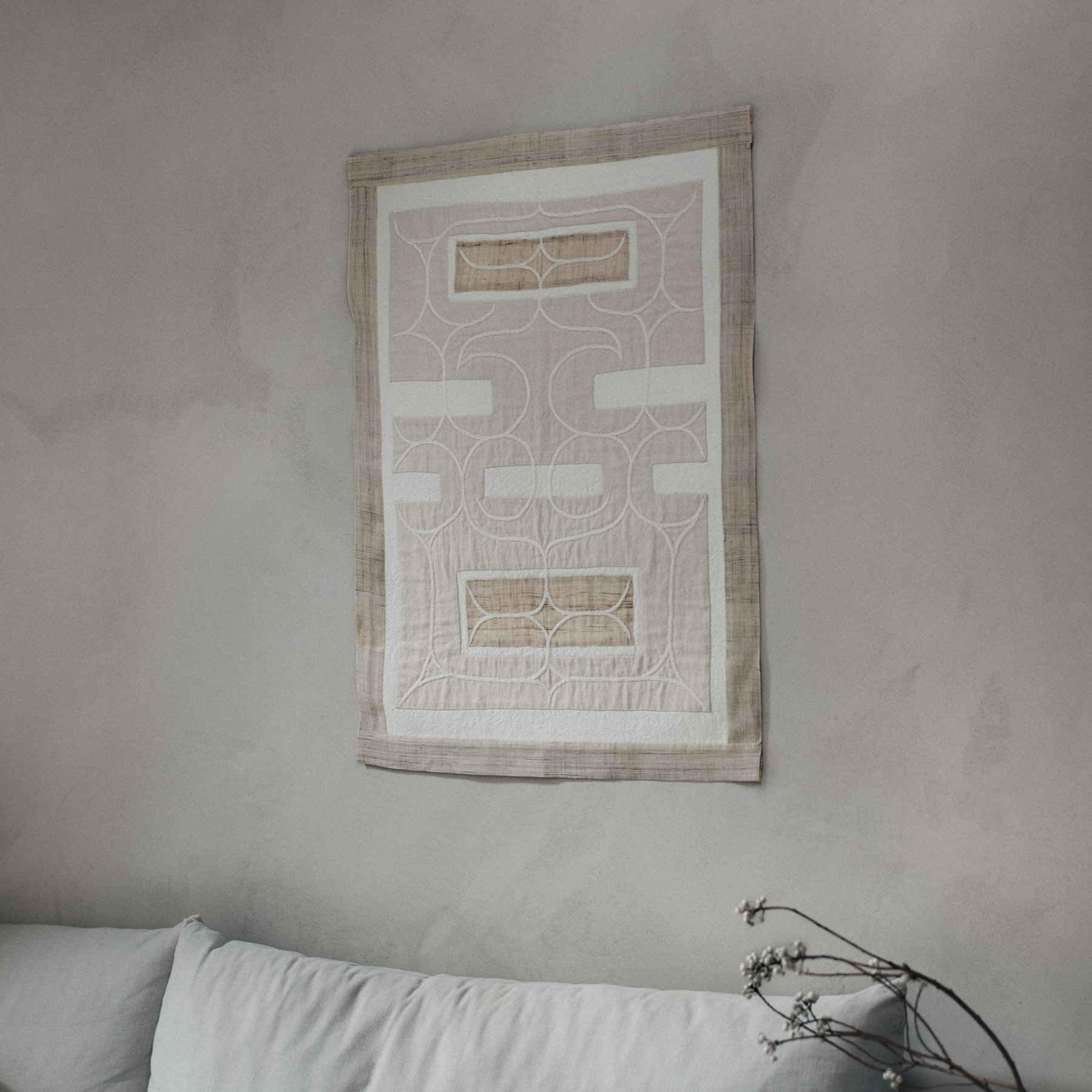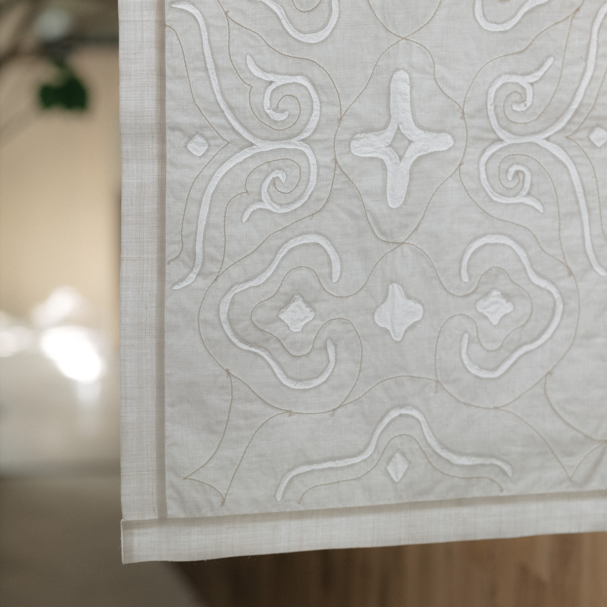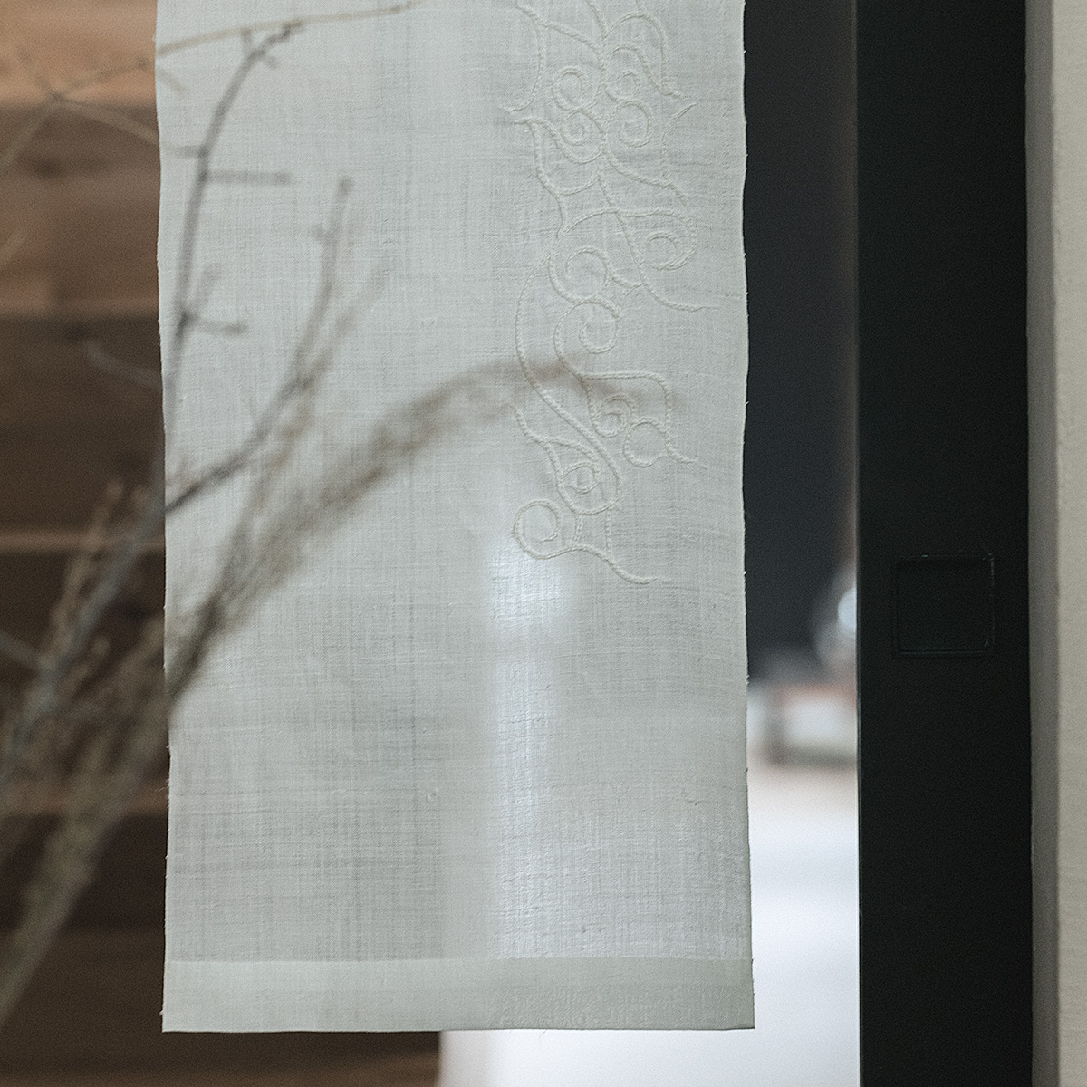 繊細な手刺繍の美しさと、インテリアに存在感を与える大判の機械刺繍、それぞれの違いもお楽しみください。