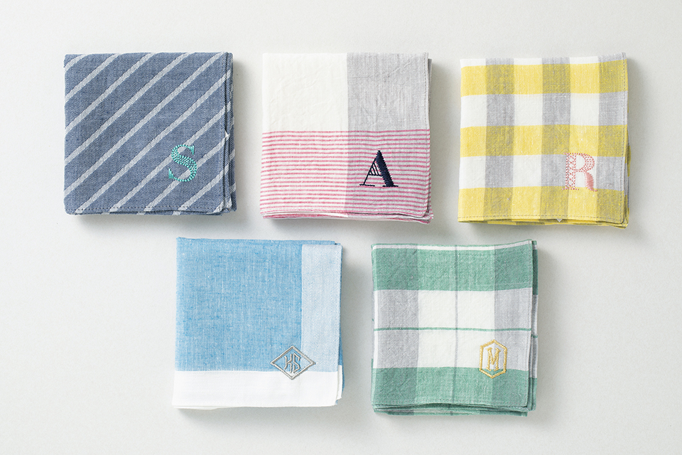 ご購入いただいたハンカチに、イニシャルや平仮名での名入れの他、ワンポイントの図柄を刺繍することができます。