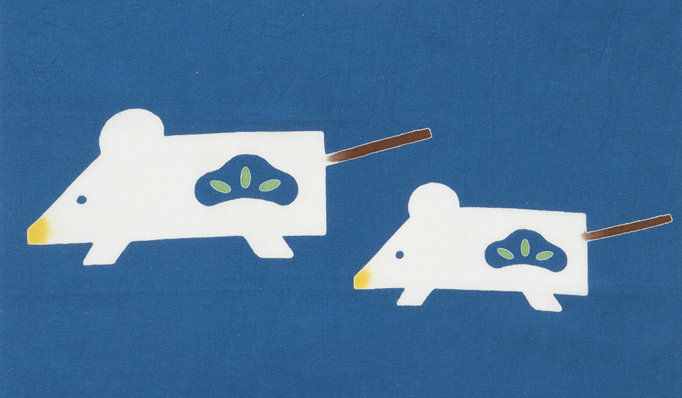 例えばこの干支のてぬぐいもシンプルな絵柄ですが、生地を紺色に染め、ねずみのシルエットの外側紺色部分に糊をつけ、ねずみの体部分の色を白く抜きながら耳や鼻は広く染まりすぎないように境界線を糊で引き、慎重に注ぎ染めていきます。
