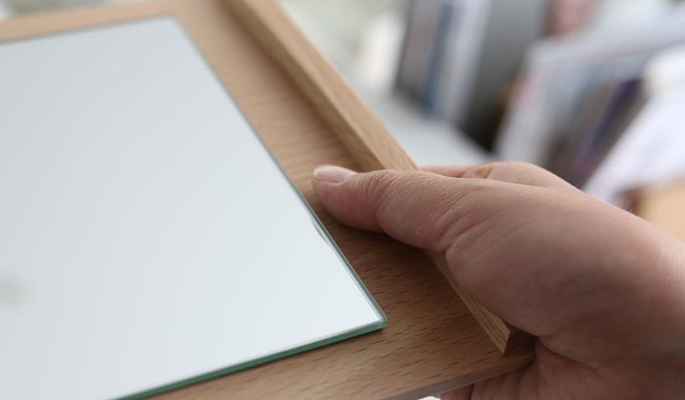 多くの鏡は、ぎりぎり端まで鏡なんです。そこで余白をもたせたサイズにして、持った時に汚れないようにしました。