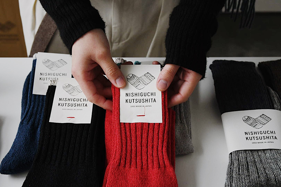 今回、期間限定の企画展では、ニット・ウィンが手掛けるファクトリーブランドNISHIGUCHI KUTSUSHITA (ニシグチクツシタ)や hakne(ハクネ) のアイテムが勢揃い。
