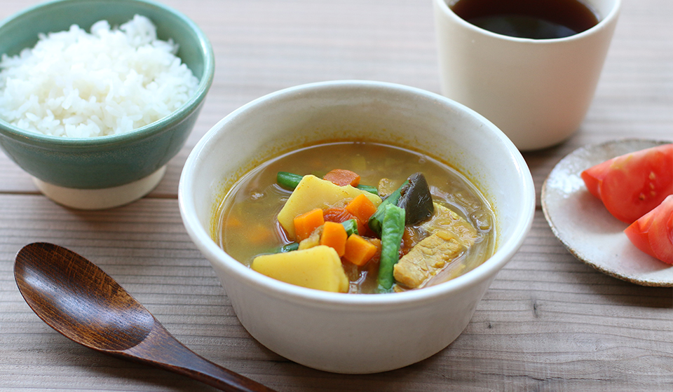 トマトの酸味に唐辛子のピリ辛、カレーの風味が効いた旨みたっぷりのスープです。