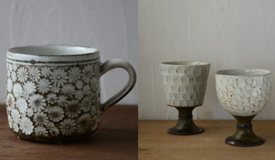 旧・都祁村に工房を構える薮本さんは、自然の素材感を生かしつつも、鱗柄や鎬の器を中心に日常の暮らしに寄り添う器を生み出し続けています。