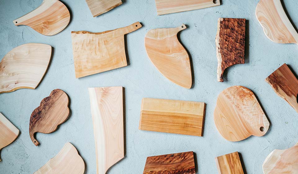 木々ひとつひとつが持つ個性を活かしたものづくりを日々の暮らしへお届する「スカイウッド」から毎回好評いただいているカッティングボードやまな板に加え、今回の企画展のためにご用意いただいた新作のジャムへらや希少木材、「榧(かや)」を用いたまな板などもお楽しみいただけます。