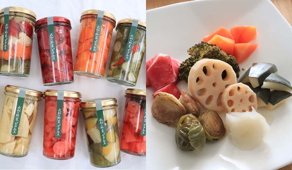 「~大和の野菜を残したい、未来へ繋げたい~」丹精込めた農家さんの野菜を無駄にしたくないと、奈良県産の食材を使って食べやすいよう素材の味を生かして作られたピクルスは、酸っぱすぎず、ほどよい酸味と甘味がありどなたにでも食べていただきやすい仕上がりになっています。ギュギュっと所狭しと瓶に詰められたピクルスを通じて奈良で育まれた定番の野菜から伝統野菜までお楽しみください。